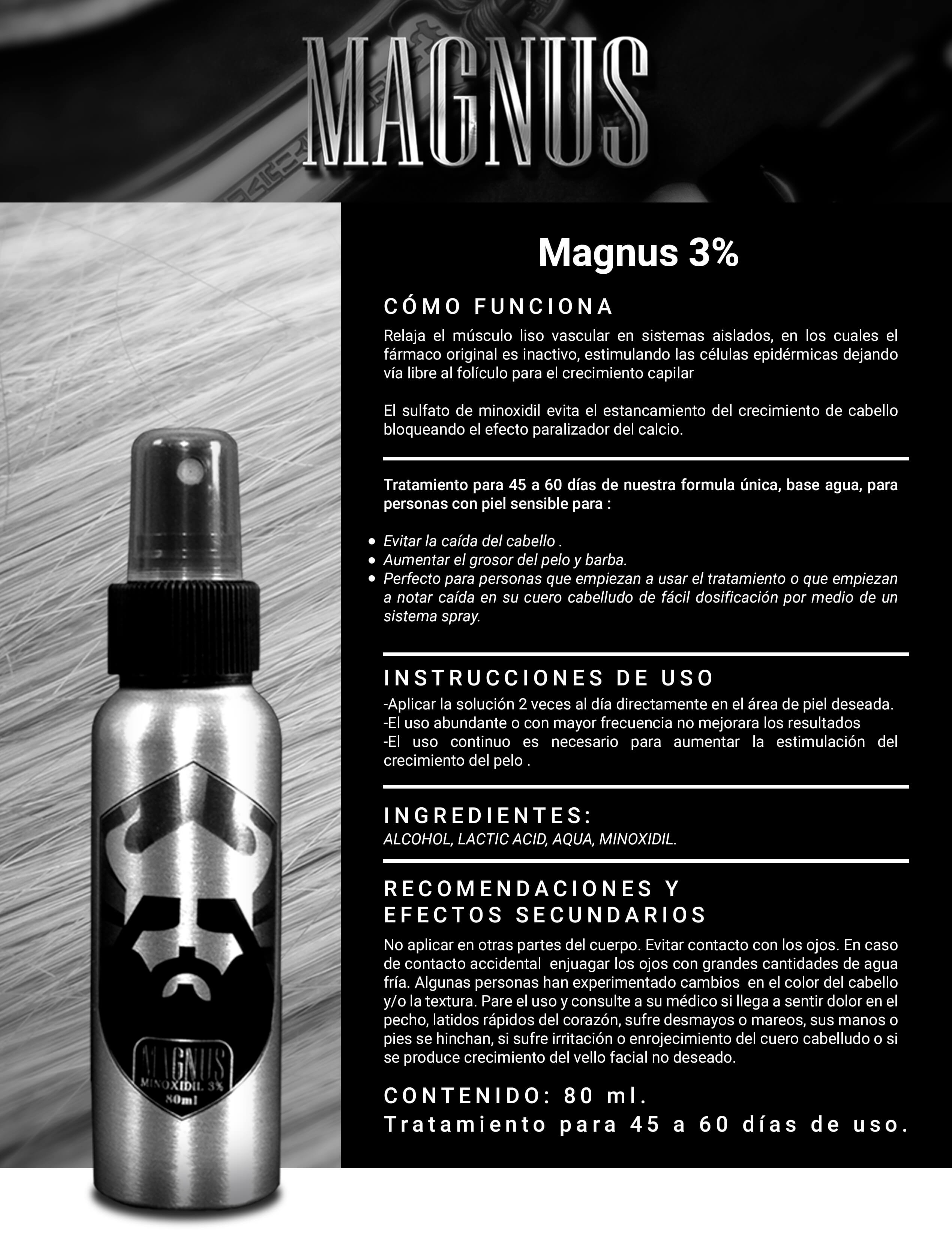 Dile adiós a la caída Tratamiento para 45 a 60 días de nuestra formula única y mejorada para evitar la caída del cabello y aumentar el grosor del pelo, perfecto para personas que empiezan a usar el tratamiento o que empiezan a notar caída en su cuero cabelludo, se presenta en formato de 80ml, de fácil dosificación por medio de un sistema spray. La molécula de minoxidil al 3% tiene una función clínicamente comprobada que funciona para detener la caída de cabello, el vehículo de nuestra solución viene enriquecido con activos que permiten una mayor penetración en la piel, haciendo que Magnus funcione de manera más rápida y efectiva.